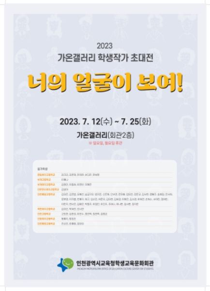 [제주교통복지신문 김강석 기자] 인천광역시교육청학생교육문화회관은 가온갤러리에서 학생 작가 초대전 ‘너의 얼굴이 보여!’를 25일까지 개최한다.
