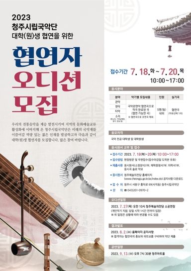 참여를 희망하는 학생은 청주예술의전당 홈페이지에서 응시원서를 내려 받아 작성한 뒤 제출서류를 포함해 오는 7월 18일부터 20일까지 청주시립국악단(청주시 서원구 흥덕로 69)으로 방문 또는 우편 제출하면 된다.