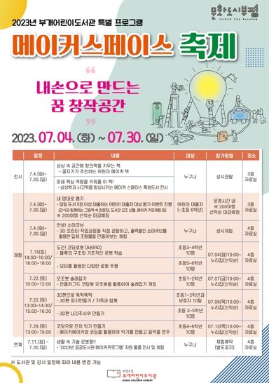 [제주교통복지신문 김강석 기자] 부평구 부개어린이도서관은 오는 30일까지 다양한 메이킹 활동을 체험하는 ‘메이커스페이스 축제’를 개최한다.