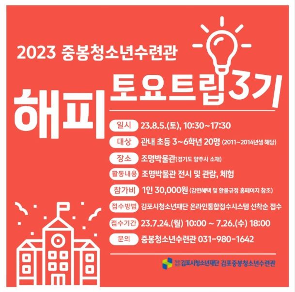[제주교통복지신문 김강석 기자] (재)김포시청소년재단 김포중봉청소년수련관에서는 김포 관내 초등 3~6학년(2011년~2014년생) 20명을 대상으로 ‘해피토요트립 3기’를 운영한다.