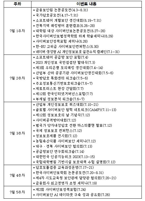 한편, 국정원, 행안부, 금융위, 복지부, 산업부, 농림부, 지자체 등 관련기관에서도 ‘정보보호의 달’을 맞이하여 논문공모전, 경진대회, 학술세미나 등 다양한 연계행사와 이벤트를 진행할 예정이다.