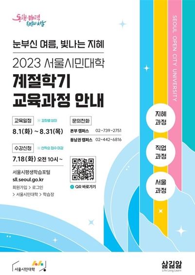 [제주교통복지신문 김강석 기자] 서울시평생교육진흥원이 운영하는 서울시민대학이 ‘눈부신 여름 빛나는 지혜’를 주제로 오는 7월 18일부터 2023년 계절학기 교육과정 수강생을 모집한다. 이번 계절학기를 통해 80개의 무료 특강을 8월 1일부터 한 달간 운영할 계획이다.