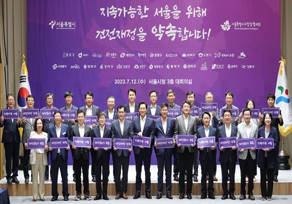 또한 오 시장·25명 구청장 전원은 ‘지속가능 서울’, ‘건전재정 약속’, ‘재정위기 극복’이 적힌 메시지 보드판을 들고 건전재정을 다짐하는 퍼포먼스를 전개했다.
