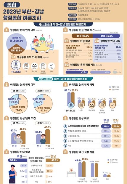 부산-경남 행정통합 여론조사는 지난 5~6월간 총 2차례에 걸쳐 총 4,000여 명을 대상으로 실시됐으며, 그 결과 행정통합 추진 논의에 대한 시도민의 인지와 찬성 의견이 과반에 못 미치는 것으로 나타났다.