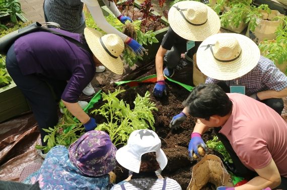 영통구치매안심센터 하늘정원에서 진행된 ‘유(愉).기.농’ 참가자들은 엽채류와 구황작물을 수확하고, 수확한 작물로 감자샐러드빵을 만들었다. 치유농업 체험 후에는 프로그램 활동 영상을 감상했다.