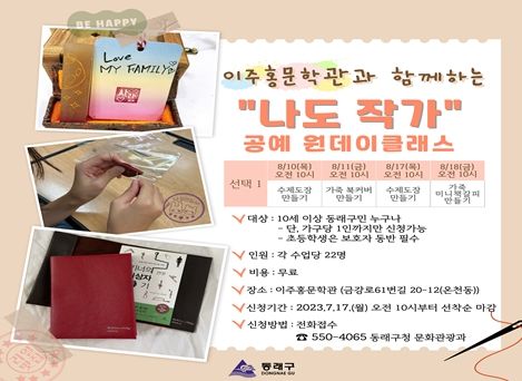 근대 아동문학을 이끈 향파 이주홍 선생의 일생과 문학, 예술창작의 기록을 엿볼 수 있는 이주홍문학관에서 열리는 이번 동래구 주최의 공예 원데이클래스 “나도 작가”는 8월 10일과 17일 수제도장 만들기, 8월 11일 가죽 북커버 만들기, 8월 18일 가죽 미니책갈피 만들기로 구성했다.