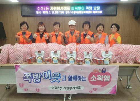 수정2동 자원봉사캠프는 회원들의 성금과 외부 후원금을 통하여 식료품과 생필품을 구입하여 쪽방 이웃들에게 전달하고 있으며, 이번 방문에는 여름철 초복을 맞이하여 건강한 여름을 보낼 수 있도록 삼계탕 키트와 쿨 스카프 등을 쪽방 이웃 40세대에 직접 전달하며 건강과 안부를 확인했다.