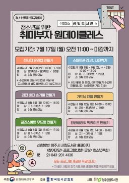 [제주교통복지신문 김강석 기자] 청주금빛도서관은 ‘취미부자 원데이클레스’ 수강생을 모집한다고 12일 밝혔다.