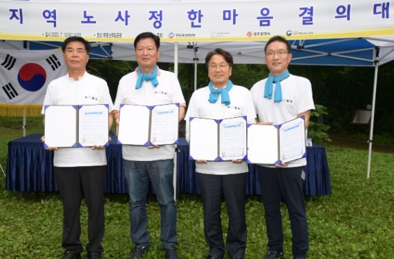 광주광역시와 한국노총광주본부, 광주경영자총협회, 광주지방고용노동청는 12일 오후 2시 무등산국립공원 증심사 입구에서 ‘한마음 결의대회’를 열고 노사상생협약을 체결했다.