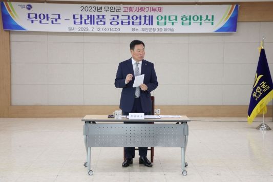 [제주교통복지신문 김강석 기자] 전남 무안군은 지난 12일 고향사랑기부제 답례품 공급업체로 추가 선정된 14개 업체와 업무 협약을 체결하고, 기부자에게 다양한 답례품을 제공하여 고향사랑기부제의 활성화를 도모하기로 했다.