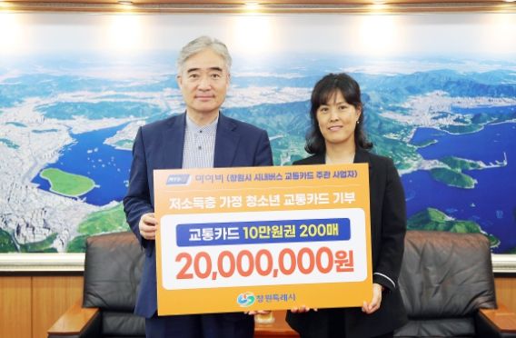 [제주교통복지신문 김강석 기자] 창원특례시는 창원시 시내버스 교통카드시스템 주관 사업자인 ㈜마이비에서 관내 저소득층 가정 청소년의 등하굣길 지원을 위해 교통카드 10만원권 200매(2천만원 상당) 지원 기탁식을 12일 제2부시장실에서 가졌다고 밝혔다.