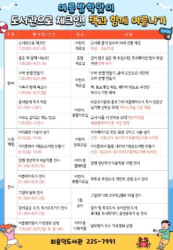 또한, 초등학생을 대상으로 ‘하브루타 독서토론 온책읽기’를 포함한 10개의 방학특강이 진행되며, 강좌에 대한 사전 신청은 7월 18일 화요일 오전 10시부터 최윤덕도서관 누리집에서 선착순 가능하다.