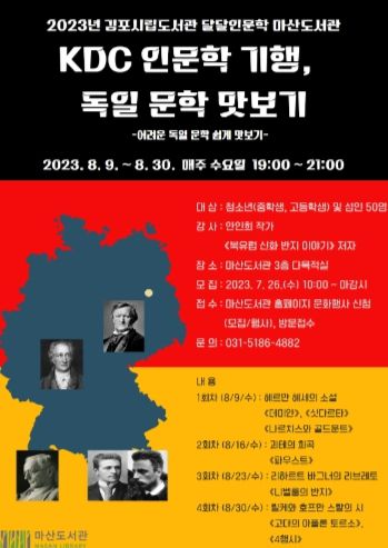 [제주교통복지신문 김강석 기자] 김포시립도서관 마산도서관은 8월 9일부터 30일까지 매주 수요일 오후 7시부터 9시, 마산도서관 3층 다목적실에서 8월 달달인문학 ‘KDC 인문학 기행, 독일 문학 맛보기’를 운영한다.