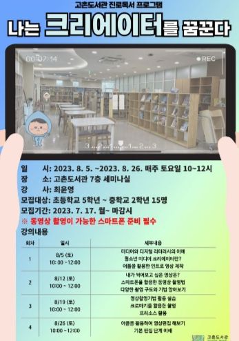 [제주교통복지신문 김강석 기자] 김포시 고촌도서관은 8월 5일부터 26일까지 매주 토요일 10시부터 두 시간에 걸쳐 청소년 진로독서 프로그램 ‘나는 크리에이터를 꿈꾼다’를 운영한다.