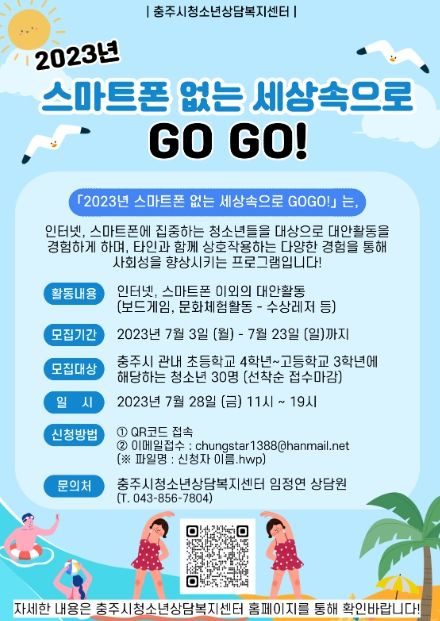 [제주교통복지신문 김강석 기자] 충주시청소년상담복지센터는 여름방학을 맞아 ‘2023년 스마트폰 없는 세상 속으로 GOGO!’ 프로그램 참가자를 오는 23일까지 모집 중이다.