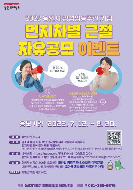 [제주교통복지신문 김강석 기자] 용인특례시가 사회 전반의 평등의식 확산을 위해 ‘먼지차별 근절 자유공모 이벤트’를 진행한다고 13일 밝혔다.