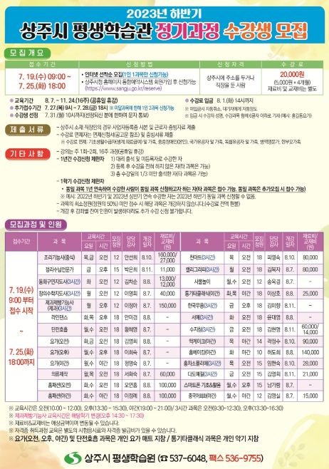 수강 신청은 7월 19일부터 7월 25일까지 상주시청 홈페이지 통합예약시스템을 통해 이루어지며, 선착순으로 모집한다. 자세한 사항은 평생학습원 홈페이지 공지 사항 또는 전화로 문의하면 안내받을 수 있다.