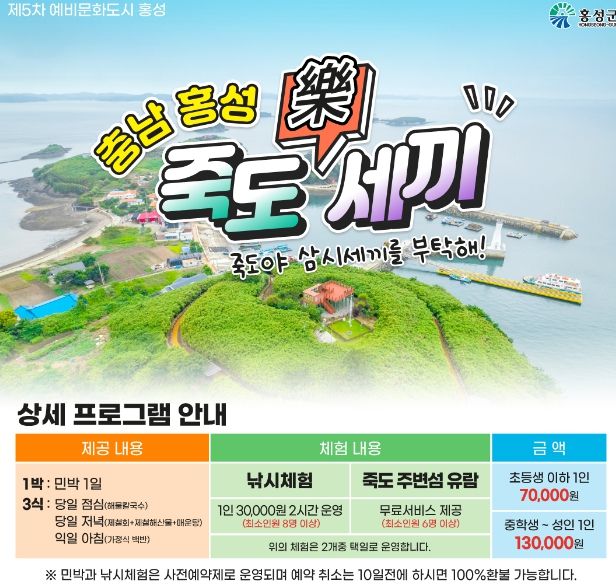 홍성군은 7월 이달의 섬 선정을 기념해 관광객들의 눈과 마음, 입까지 사로잡을 '죽도야 삼시세끼를 부탁해!’ 프로그램을 운영한다고 밝혔다.