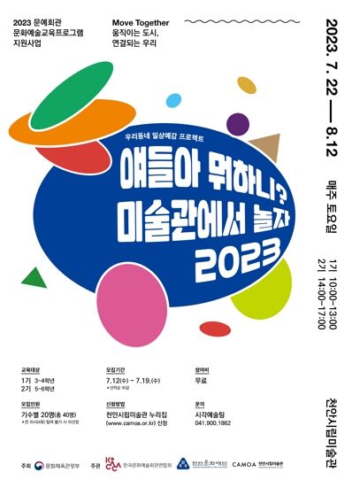 [제주교통복지신문 김강석 기자] 천안시립미술관은 오는 22일부터 문예회관 문화예술교육프로그램 지원사업 ‘얘들아 뭐하니? 미술관에서 놀자 2023’를 진행한다고 밝혔다.