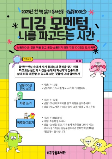 이를 위해 남동구립도서관은 자료관리심의회를 통해 ‘디깅 모멘텀, 나를 파고드는 시간’이란 주제로 남동 100선을 심의·선정했다.