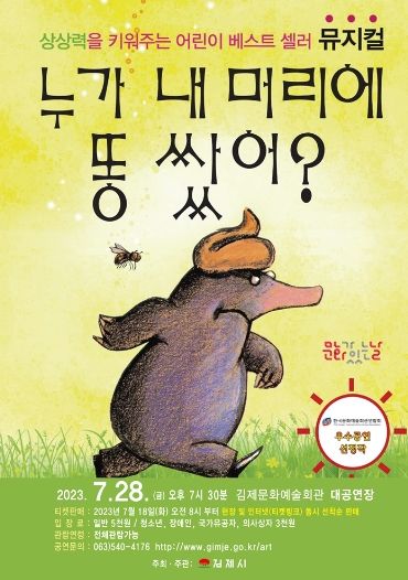 [제주교통복지신문 김강석 기자] 아이들의 호기심을 키워주고 즐거움을 선물해 줄 어린이 뮤지컬 '누가 내 머리에 똥 쌌어?'가 문화가 있는 날을 맞이해 7월 28일 오후 7시 30분 김제문화예술회관 대공연장에서 펼쳐진다.