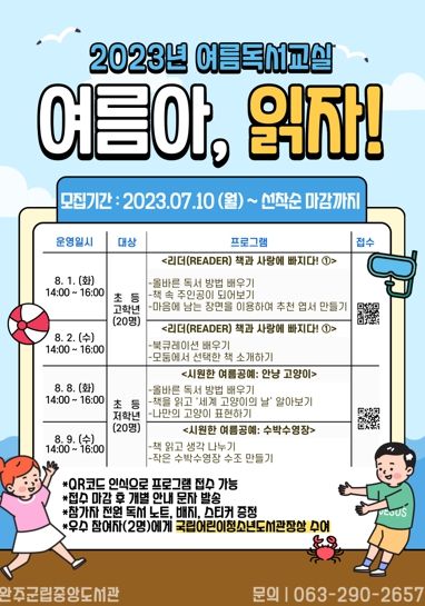 방학 동안 운영되는 프로그램은 완주군 도서관 홈페이지 독서문화 행사안내를 통해 QR 코드로 선착순 접수 가능하며, 수강료는 무료다.