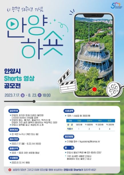 [제주교통복지신문 김강석 기자] 안양시는 시 승격 50주년을 기념해 60초 미만의 세로형 짧은 영상인 숏츠(Shorts) 공모전 ‘안양하숏!’을 진행한다고 13일 밝혔다.