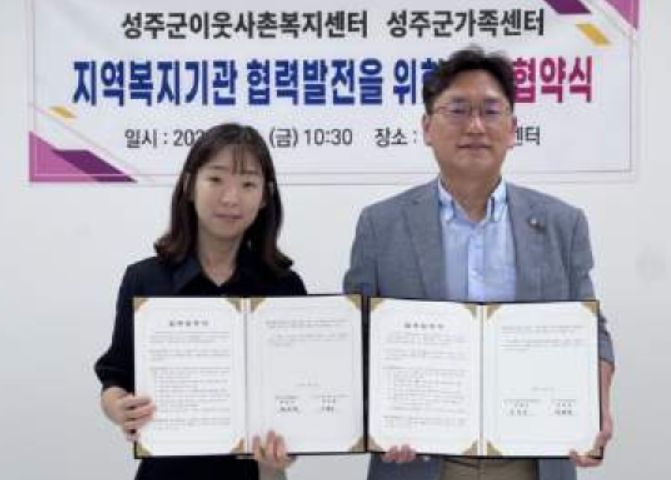 [제주교통복지신문 김강석 기자] 성주군 이웃사촌복지센터는 7월 7일 성주군가족센터와 업무협약(MOU)을 체결하고, 지역복지 기관 간 네트워크 강화 및 통합적 지역복지 전달체계 구축을 위해 함께 노력하기로 했다.