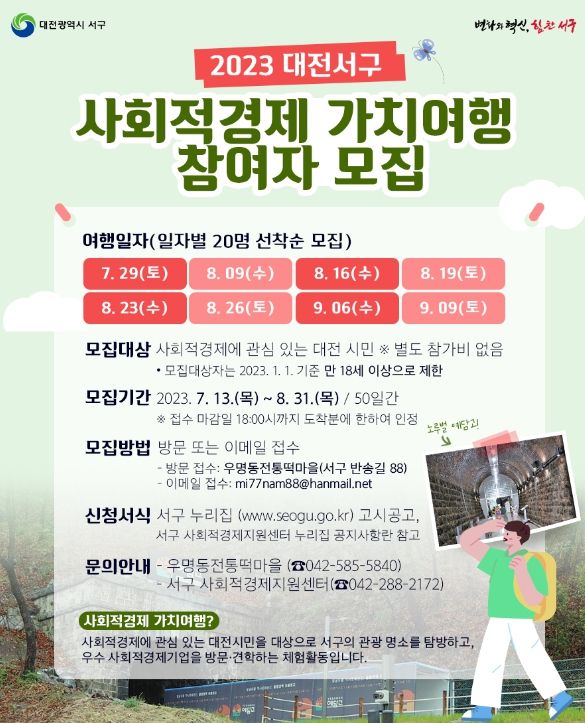 [제주교통복지신문 김강석 기자] 대전 서구는 ‘2023년 서구 사회적경제 가치여행’ 사업 참여자를 모집한다.