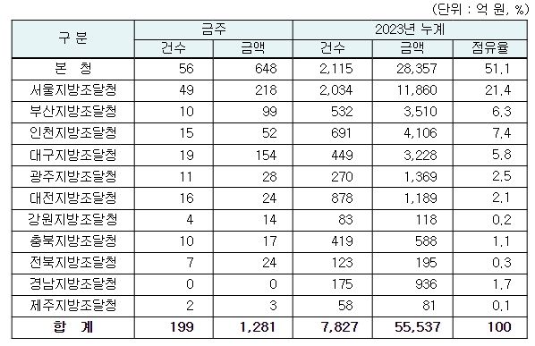 지역별 발주량을 보면 대전광역시 소재 본청 648억 원, 서울지방청 218억 원 등 2개청(866억 원)이 전체 금액(1,281억 원)의 67.6%를 차지하고 있으며, 인천 등 나머지 10개 지방청 415억 원이 각각 집행될 예정이다.