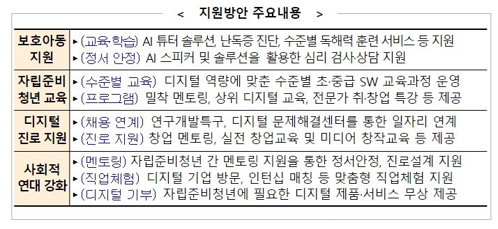 '디지털 기반 자립준비청년 지원방안'은 디지털 전환의 가속화 등으로 디지털 포용의 중요성이 증대되는 가운데, 디지털 분야에서 자립준비청년을 지원하기 위해 마련됐다. 보호아동에 대한 인공지능 활용 교육 지원 등을 시작으로, 디지털 시대를 열어가는 구성원으로서 자립준비청년들의 성장과 진로탐색, 직업적 성취를 지원하기 위한 내용을 담고 있다.