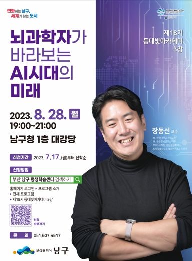 [제주교통복지신문 김강석 기자] 부산 남구는 8월 28일 열리는 제18기 등대빛 아카데미 강연에 뇌과학자 장동선 박사를 초청하여 강의를 진행한다.