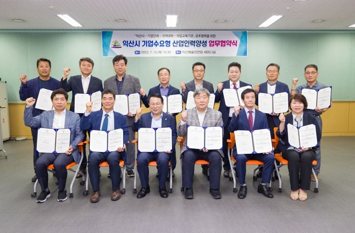 13일 익산예술의전당 세미나실에서 정헌율 익산시장, 원광대학교 박성태 총장, 원광보건대학교 이건중 기획조정처장, 한국폴리텍대학 익산캠퍼스 이창열 학장, 익산상공회의소 이윤근 사무국장, 기업단체(5개 기관) 및 직업훈련 전문기관(4개 기관) 대표 등 총 14개 기관, 30여 명이 참석한 가운데 기업수요형 산업인력 양성을 위한 업무협약을 체결했다.