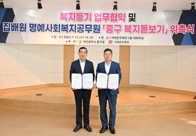 [제주교통복지신문 김강석 기자] 대전 중구는 12일 서대전우체국과 함께 복지사각지대 발굴을 위한 복지등기우편사업 업무 협약을 체결하고 집배원을 ‘중구 복지돋보기’로 위촉했다고 밝혔다.