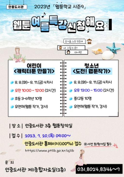 문화체육관광부가 주최하고 한국만화영상진흥원이 주관하는 이 사업은 시민들의 관심과 참여가 많아 오랜 기간 유지되고 있는 안중도서관만의 특화 사업이다. 이 사업의 하나로 상반기 웹툰 정기강좌와 웹툰 작가와의 만남이 성황리에 마무리됐고, 이어 여름방학을 맞이한 특강 프로그램이 운영될 예정이다.