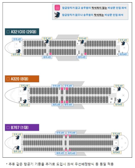 우선배정 대상 좌석은 국적사 운영 12개 기종 중, 저고도에서 개방이 가능한 비상문이 장착되고 비상문 옆에 승무원이 착석하지 않는 3개 기종(A321CEO, A320, B767) 38대 항공기의 비상문에 인접한 94개 좌석이다.