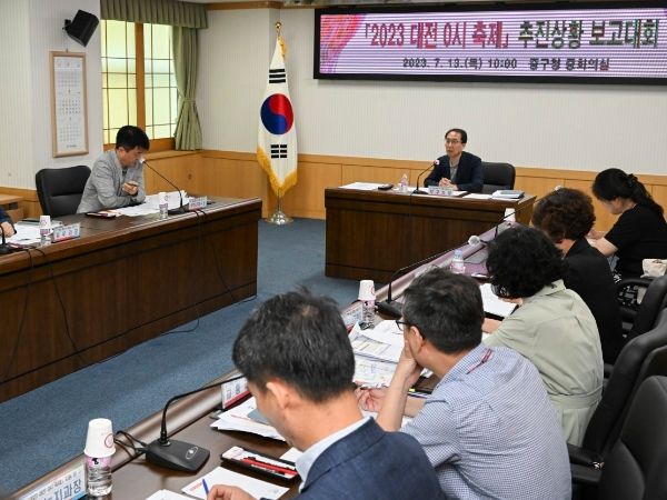 [제주교통복지신문 김강석 기자] 대전 중구는 13일 중구청 중회의실에서 ‘2023 대전0시축제 추진상황 보고대회’를 개최해 부서별 추진상황을 점검하고 예상 문제점을 도출, 대책을 논의하는 시간을 가졌다.