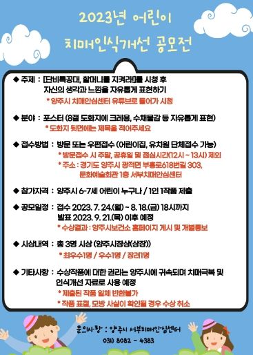 [제주교통복지신문 김강석 기자] 양주시 치매안심센터에서는 다음 달 18일까지 ‘2023년 양주시 어린이 치매인식개선 공모전’ 접수를 받는다.