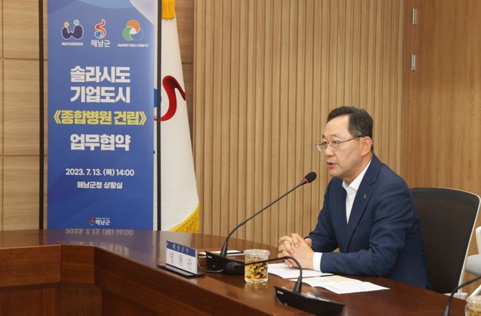 해남군과 해남우리종합병원, 서남해안기업도시개발(주)은 13일 군청 상황실에서 솔라시도 기업도시 종합병원 건립 업무협약을 체결했다.