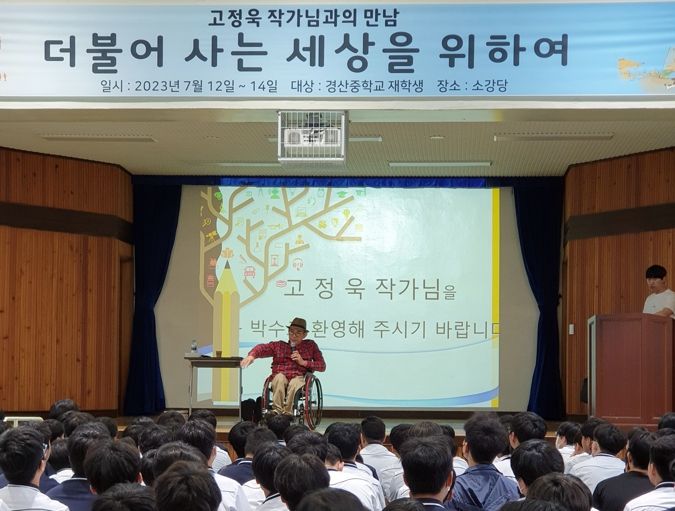[제주교통복지신문 김강석 기자] 경산교육지원청은 7월 13일 경산중과 자인중에서 학교로 찾아가는 ‘작가와의 만남’ 강연을 실시했다. 강사는 가방 들어주는 아이, 까칠한 재석이 시리즈 등 400여권을 집필한 고정욱 동화작가이다.