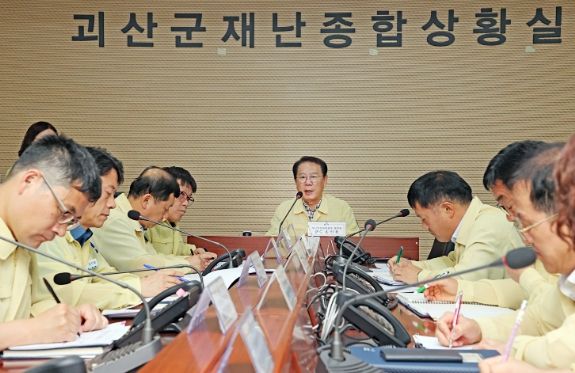 군은 13일 호우특보에 따라 재난안전대책본부를 가동했으며, 재난안전대책본부장인 송인헌 괴산군수 주재로 부서별 중점 관리사항 및 대처 사항을 점검하기 위해 상황판단회의를 개최했다.