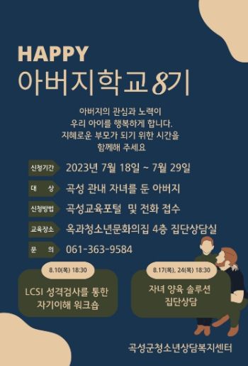 ‘행복한 아버지 학교’는 지역 내 자녀들 둔 아버지 20명을 대상으로 운영된다. 강의는 오는 8월 10일부터 24일까지 매주 목요일 오후 6시 30분에 곡성군청소년상담복지센터 4층 집단상담실에서 진행된다.