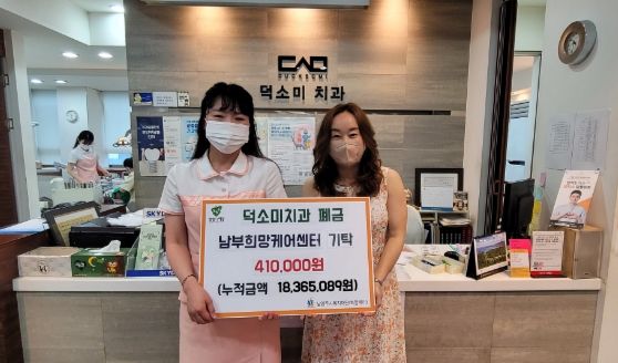 [제주교통복지신문 김강석 기자] 남양주시 와부읍 소재 덕소미치과는 지난 11일 치과 이용 환자 5명의 폐금을 기부받아 마련된 410,000원의 수익금을 남부희망케어센터에 기탁했다.
