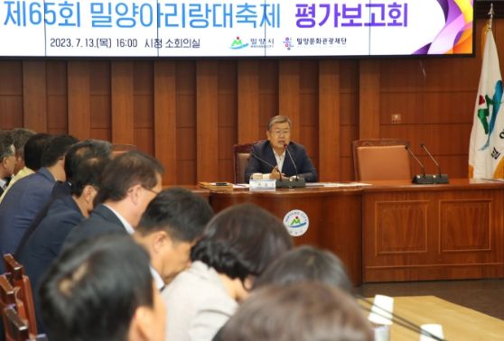 [제주교통복지신문 김강석 기자] 밀양시는 13일 시청 소회의실에서 제65회 밀양아리랑대축제 평가 보고회를 개최했다. 보고회에는 박일호 시장과 시의원, 행사 주관 단체장 등 40여 명이 참석했다.