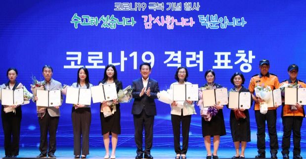 유공자 시상식과 코로나19 극복영상, 헌정공연 등으로 진행된 행사에선 지난 6월 1일 자로 코로나19 위기 단계가 ‘심각’에서 ‘경계’ 단계로 하향 조정됨에 따라 3년 6개월여 기간 최일선에서 헌신한 도민, 의료진, 공직자 등 120여 명에게 표창을 전달해 그동안의 노고를 격려하고 감사의 마음을 전했다.