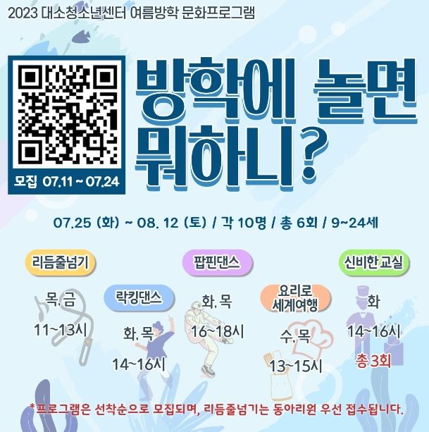 2023년 방학에 놀면 뭐하니? 프로그램은 리듬줄넘기, 락킹댄스, 팝핀댄스, 요리로 세계여행, 신비한 마술사교실 총 5개의 프로그램으로 지난 프로그램의 만족도 조사 의견과 청소년들의 신체활동 증진과 흥미를 반영해 수렴한 프로그램들로 구성했으며 25일부터 8월 12일까지 총 6회 차(마술 프로그램은 3회 운영)로 운영된다.