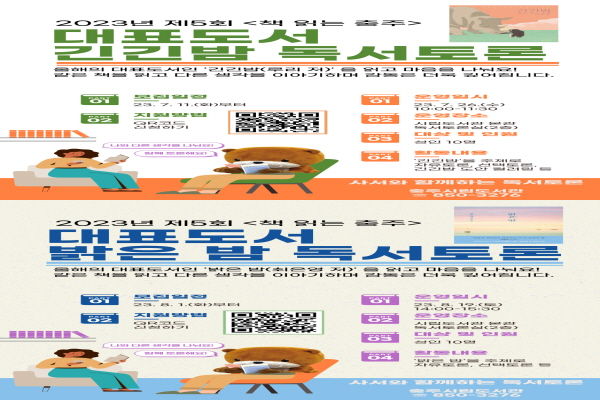 [제주교통복지신문 김강석 기자] 충주시립도서관은 2023년 제5회 '책 읽는 충주' 독서운동의 일환으로 대표도서 독서토론을 7월과 8월 총 2회 운영한다.