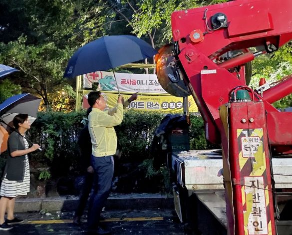 현장에 도착한 오 구청장은 피해 상황을 확인하고 전신주 복구 작업과 인근 아파트 전력 공급이 완료될 때까지 주민들을 살피며 현장을 지켰다.