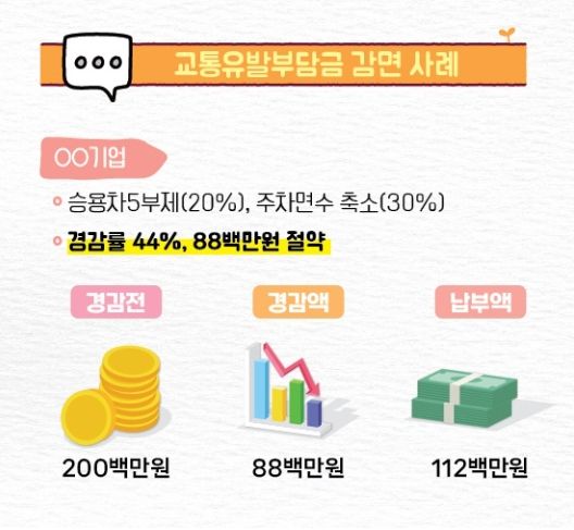 ‘기업체 교통수요관리’란 교통유발부담금 부과 대상 기업체 등이 자발적으로 교통량 감축 프로그램에 참여하면 이행 실적에 따라 교통유발부담금을 최대 40%까지 감면해 주는 제도다. 지난해 교통수요관리에 참여한 17개 업체가 교통유발부담금 약 4억 원을 감면받았다.