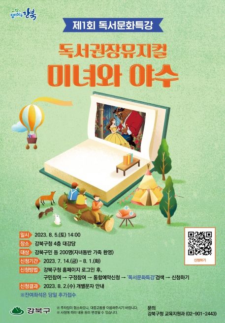 [제주교통복지신문 김강석 기자] 서울 강북구는 ‘제1회 독서문화특강’의 일환으로 오는 8월 5일(토) 독서권장뮤지컬 ‘미녀와 야수’를 상영한다고 밝혔다.